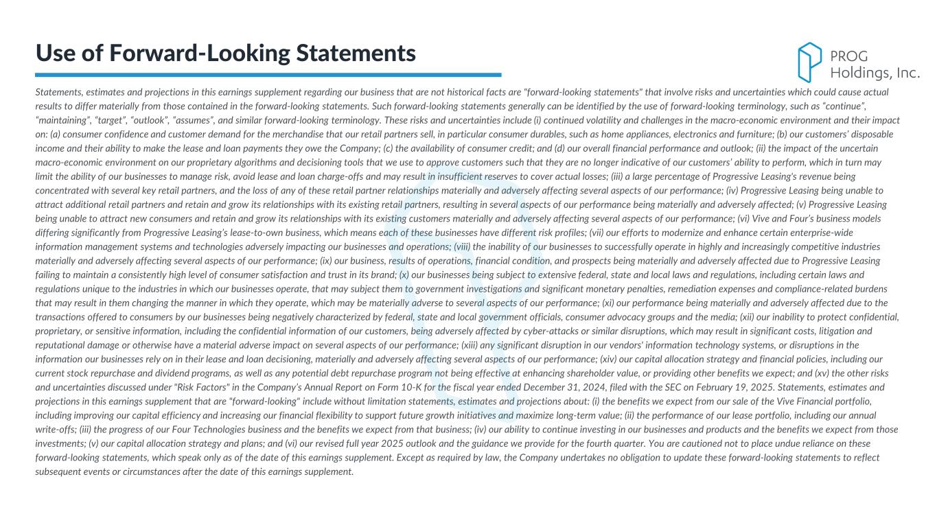 Statements, estimates and projections in this earnings supplement regarding our business that are not historical facts are "forward-looking statements" that involve risks and uncertainties which could cause actual results to differ materially from those contained in the forward-looking statements. Such forward-looking statements generally can be identified by the use of forward-looking terminology, such as “continue”, “maintaining”, “target”, “outlook”, “assumes”, and similar forward-looking terminology. These risks and uncertainties include (i) continued volatility and challenges in the macro-economic environment and their impact on: (a) consumer confidence and customer demand for the merchandise that our retail partners sell, in particular consumer durables, such as home appliances, electronics and furniture; (b) our customers’ disposable income and their ability to make the lease and loan payments they owe the Company; (c) the availability of consumer credit; and (d) our overall financial performance and outlook; (ii) the impact of the uncertain macro-economic environment on our proprietary algorithms and decisioning tools that we use to approve customers such that they are no longer indicative of our customers’ ability to perform, which in turn may limit the ability of our businesses to manage risk, avoid lease and loan charge-offs and may result in insufficient reserves to cover actual losses; (iii) a large percentage of Progressive Leasing's revenue being concentrated with several key retail partners, and the loss of any of these retail partner relationships materially and adversely affecting several aspects of our performance; (iv) Progressive Leasing being unable to attract additional retail partners and retain and grow its relationships with its existing retail partners, resulting in several aspects of our performance being materially and adversely affected; (v) Progressive Leasing being unable to attract new consumers and retain and grow its relationships with its existing customers materially and adversely affecting several aspects of our performance; (vi) Vive and Four’s business models differing significantly from Progressive Leasing’s lease-to-own business, which means each of these businesses have different risk profiles; (vii) our efforts to modernize and enhance certain enterprise-wide information management systems and technologies adversely impacting our businesses and operations; (viii) the inability of our businesses to successfully operate in highly and increasingly competitive industries materially and adversely affecting several aspects of our performance; (ix) our business, results of operations, financial condition, and prospects being materially and adversely affected due to Progressive Leasing failing to maintain a consistently high level of consumer satisfaction and trust in its brand; (x) our businesses being subject to extensive federal, state and local laws and regulations, including certain laws and regulations unique to the industries in which our businesses operate, that may subject them to government investigations and significant monetary penalties, remediation expenses and compliance-related burdens that may result in them changing the manner in which they operate, which may be materially adverse to several aspects of our performance; (xi) our performance being materially and adversely affected due to the transactions offered to consumers by our businesses being negatively characterized by federal, state and local government officials, consumer advocacy groups and the media; (xii) our inability to protect confidential, proprietary, or sensitive information, including the confidential information of our customers, being adversely affected by cyber-attacks or similar disruptions, which may result in significant costs, litigation and reputational damage or otherwise have a material adverse impact on several aspects of our performance; (xiii) any significant disruption in our vendors' information technology systems, or disruptions in the information our businesses rely on in their lease and loan decisioning, materially and adversely affecting several aspects of our performance; (xiv) our capital allocation strategy and financial policies, including our current stock repurchase and dividend programs, as well as any potential debt repurchase program not being effective at enhancing shareholder value, or providing other benefits we expect; and (xv) the other risks and uncertainties discussed under "Risk Factors" in the Company’s Annual Report on Form 10-K for the fiscal year ended December 31, 2024, filed with the SEC on February 19, 2025. Statements, estimates and projections in this earnings supplement that are "forward-looking" include without limitation statements, estimates and projections about: (i) the benefits we expect from our sale of the Vive Financial portfolio, including improving our capital efficiency and increasing our financial flexibility to support future growth initiatives and maximize long-term value; (ii) the performance of our lease portfolio, including our annual write-offs; (iii) the progress of our Four Technologies business and the benefits we expect from that business; (iv) our ability to continue investing in our businesses and products and the benefits we expect from those investments; (v) our capital allocation strategy and plans; and (vi) our revised full year 2025 outlook and the guidance we provide for the fourth quarter. You are cautioned not to place undue reliance on these forward-looking statements, which speak only as of the date of this earnings supplement. Except as required by law, the Company undertakes no obligation to update these forward-looking statements to reflect subsequent events or circumstances after the date of this earnings supplement. Use of Forward-Looking Statements