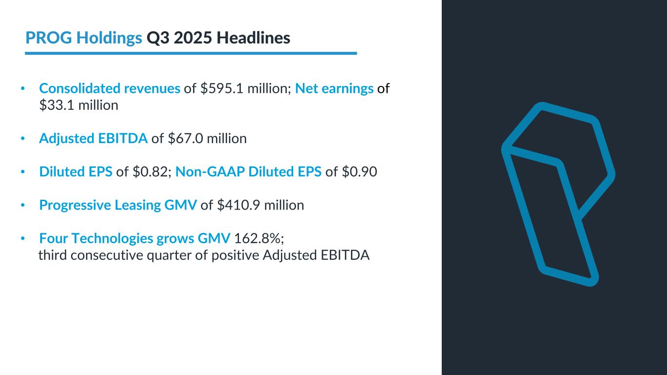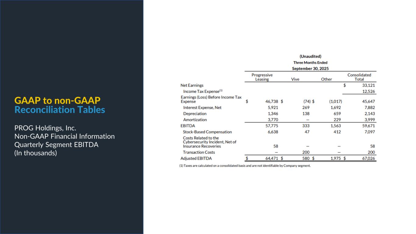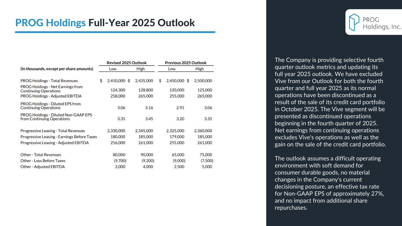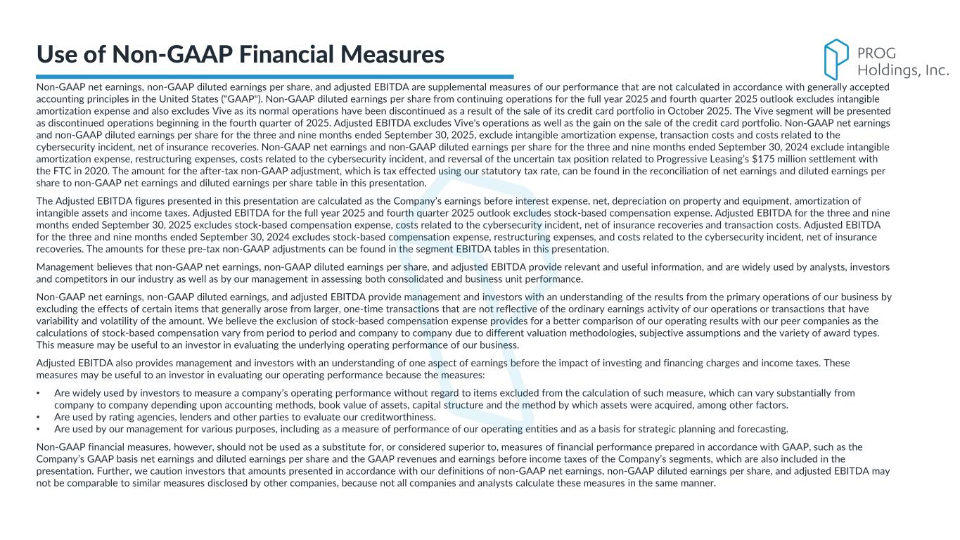 PROG Internal Non-GAAP net earnings, non-GAAP diluted earnings per share, and adjusted EBITDA are supplemental measures of our performance that are not calculated in accordance with generally accepted accounting principles in the United States ("GAAP"). Non-GAAP diluted earnings per share from continuing operations for the full year 2025 and fourth quarter 2025 outlook excludes intangible amortization expense and also excludes Vive as its normal operations have been discontinued as a result of the sale of its credit card portfolio in October 2025. The Vive segment will be presented as discontinued operations beginning in the fourth quarter of 2025. Adjusted EBITDA excludes Vive's operations as well as the gain on the sale of the credit card portfolio. Non-GAAP net earnings and non-GAAP diluted earnings per share for the three and nine months ended September 30, 2025, exclude intangible amortization expense, transaction costs and costs related to the cybersecurity incident, net of insurance recoveries. Non-GAAP net earnings and non-GAAP diluted earnings per share for the three and nine months ended September 30, 2024 exclude intangible amortization expense, restructuring expenses, costs related to the cybersecurity incident, and reversal of the uncertain tax position related to Progressive Leasing’s $175 million settlement with the FTC in 2020. The amount for the after-tax non-GAAP adjustment, which is tax effected using our statutory tax rate, can be found in the reconciliation of net earnings and diluted earnings per share to non-GAAP net earnings and diluted earnings per share table in this presentation. The Adjusted EBITDA figures presented in this presentation are calculated as the Company’s earnings before interest expense, net, depreciation on property and equipment, amortization of intangible assets and income taxes. Adjusted EBITDA for the full year 2025 and fourth quarter 2025 outlook excludes stock-based compensation expense. Adjusted EBITDA for the three and nine months ended September 30, 2025 excludes stock-based compensation expense, costs related to the cybersecurity incident, net of insurance recoveries and transaction costs. Adjusted EBITDA for the three and nine months ended September 30, 2024 excludes stock-based compensation expense, restructuring expenses, and costs related to the cybersecurity incident, net of insurance recoveries. The amounts for these pre-tax non-GAAP adjustments can be found in the segment EBITDA tables in this presentation. Management believes that non-GAAP net earnings, non-GAAP diluted earnings per share, and adjusted EBITDA provide relevant and useful information, and are widely used by analysts, investors and competitors in our industry as well as by our management in assessing both consolidated and business unit performance. Non-GAAP net earnings, non-GAAP diluted earnings, and adjusted EBITDA provide management and investors with an understanding of the results from the primary operations of our business by excluding the effects of certain items that generally arose from larger, one-time transactions that are not reflective of the ordinary earnings activity of our operations or transactions that have variability and volatility of the amount. We believe the exclusion of stock-based compensation expense provides for a better comparison of our operating results with our peer companies as the calculations of stock-based compensation vary from period to period and company to company due to different valuation methodologies, subjective assumptions and the variety of award types. This measure may be useful to an investor in evaluating the underlying operating performance of our business. Adjusted EBITDA also provides management and investors with an understanding of one aspect of earnings before the impact of investing and financing charges and income taxes. These measures may be useful to an investor in evaluating our operating performance because the measures: • Are widely used by investors to measure a company’s operating performance without regard to items excluded from the calculation of such measure, which can vary substantially from company to company depending upon accounting methods, book value of assets, capital structure and the method by which assets were acquired, among other factors. • Are used by rating agencies, lenders and other parties to evaluate our creditworthiness. • Are used by our management for various purposes, including as a measure of performance of our operating entities and as a basis for strategic planning and forecasting. Non-GAAP financial measures, however, should not be used as a substitute for, or considered superior to, measures of financial performance prepared in accordance with GAAP, such as the Company’s GAAP basis net earnings and diluted earnings per share and the GAAP revenues and earnings before income taxes of the Company’s segments, which are also included in the presentation. Further, we caution investors that amounts presented in accordance with our definitions of non-GAAP net earnings, non-GAAP diluted earnings per share, and adjusted EBITDA may not be comparable to similar measures disclosed by other companies, because not all companies and analysts calculate these measures in the same manner. Use of Non-GAAP Financial Measures