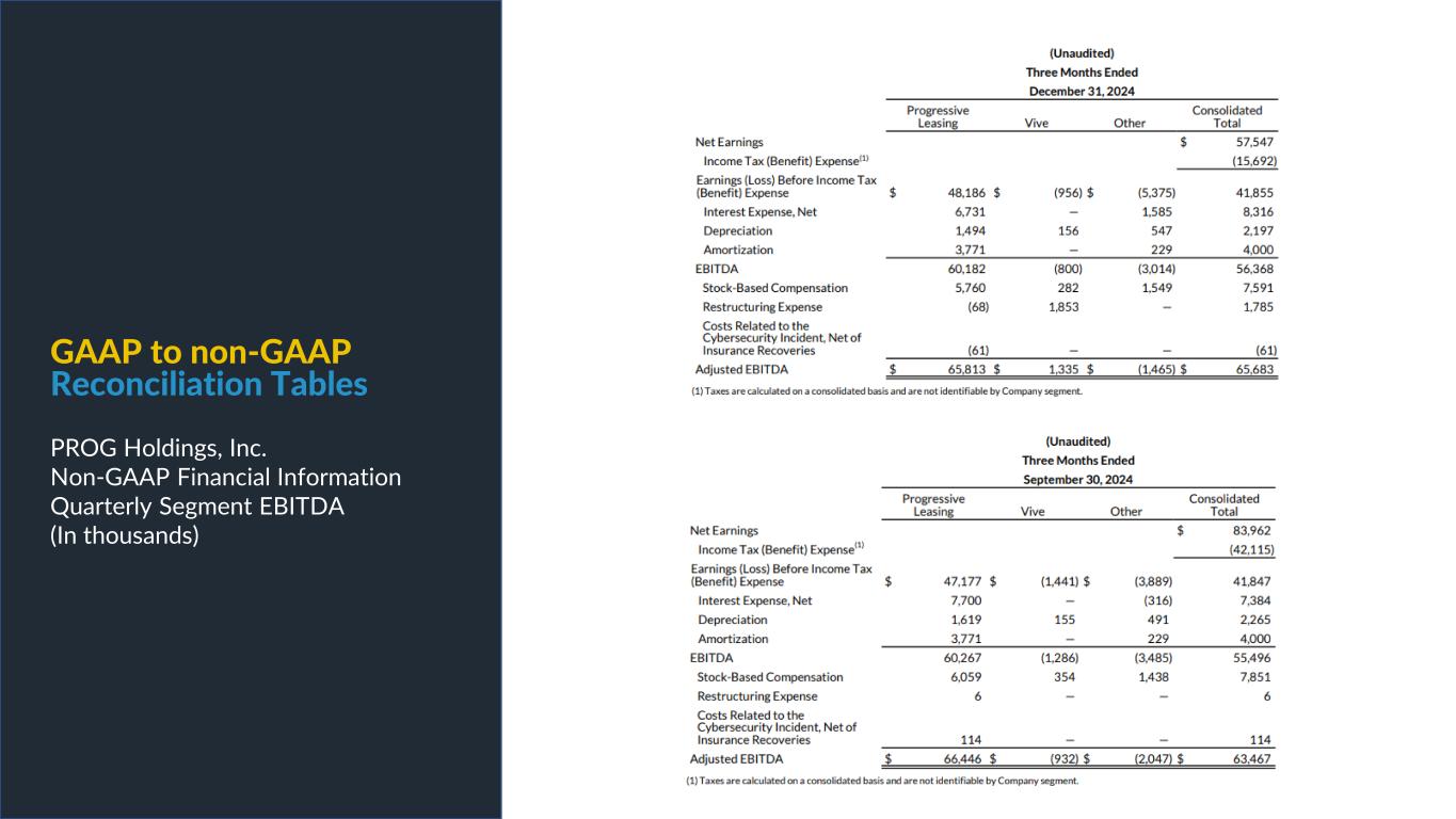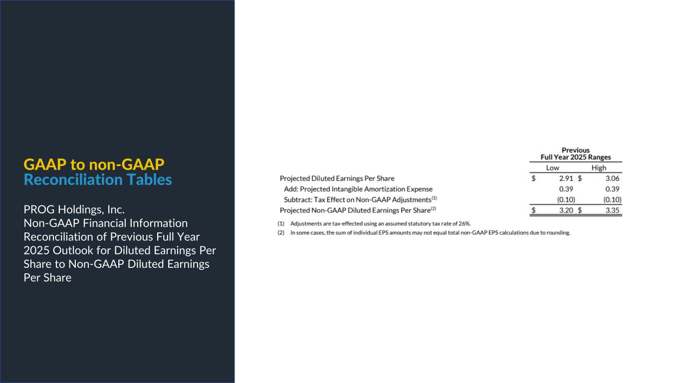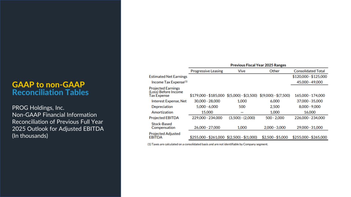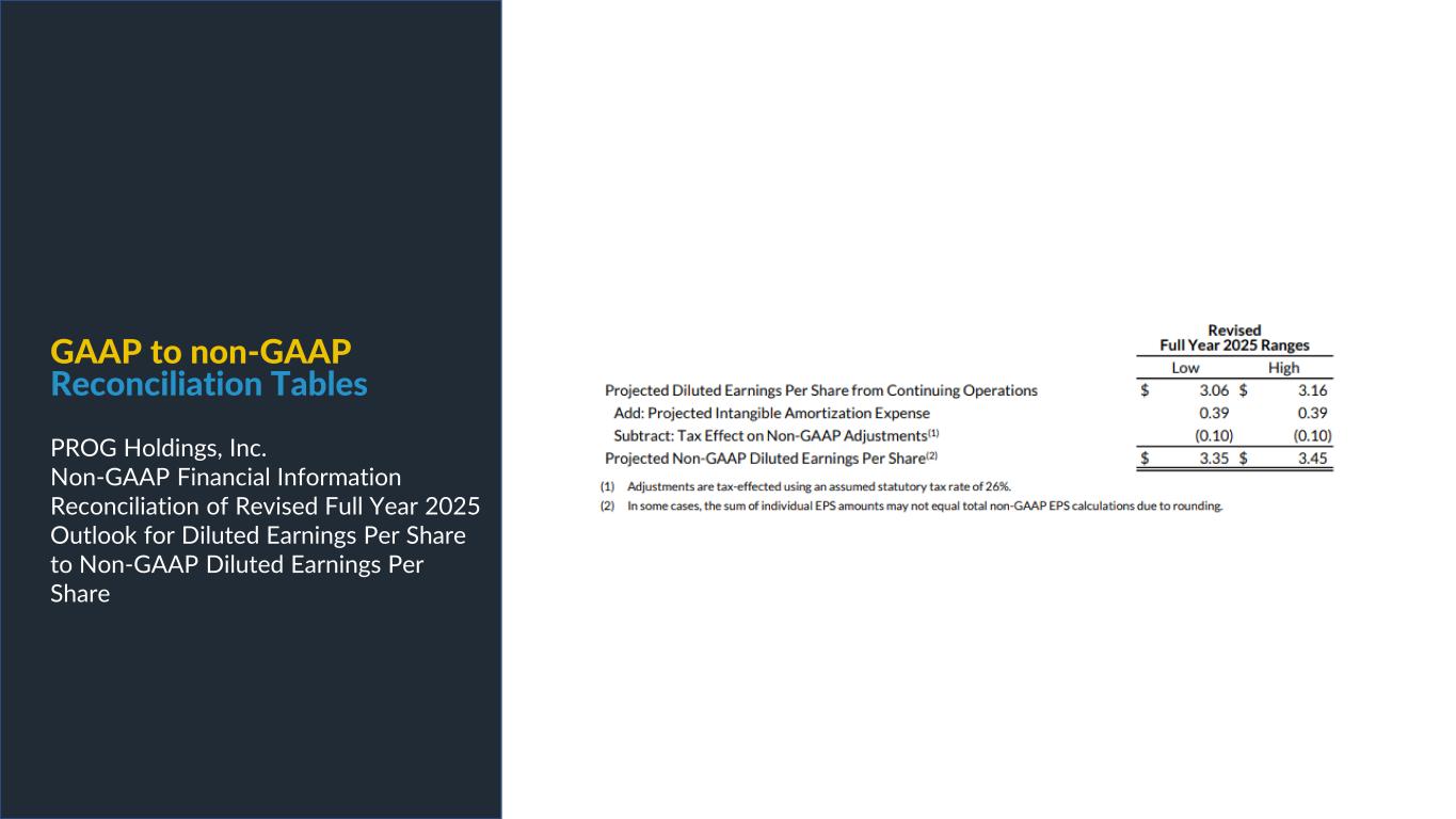 PROG Internal Non-GAAP net earnings, non-GAAP diluted earnings per share, and adjusted EBITDA are supplemental measures of our performance that are not calculated in accordance with generally accepted accounting principles in the United States ("GAAP"). Non-GAAP diluted earnings per share from continuing operations for the full year 2025 and fourth quarter 2025 outlook excludes intangible amortization expense and also excludes Vive as its normal operations have been discontinued as a result of the sale of its credit card portfolio in October 2025. The Vive segment will be presented as discontinued operations beginning in the fourth quarter of 2025. Adjusted EBITDA excludes Vive's operations as well as the gain on the sale of the credit card portfolio. Non-GAAP net earnings and non-GAAP diluted earnings per share for the three and nine months ended September 30, 2025, exclude intangible amortization expense, transaction costs and costs related to the cybersecurity incident, net of insurance recoveries. Non-GAAP net earnings and non-GAAP diluted earnings per share for the three and nine months ended September 30, 2024 exclude intangible amortization expense, restructuring expenses, costs related to the cybersecurity incident, and reversal of the uncertain tax position related to Progressive Leasing’s $175 million settlement with the FTC in 2020. The amount for the after-tax non-GAAP adjustment, which is tax effected using our statutory tax rate, can be found in the reconciliation of net earnings and diluted earnings per share to non-GAAP net earnings and diluted earnings per share table in this presentation. The Adjusted EBITDA figures presented in this presentation are calculated as the Company’s earnings before interest expense, net, depreciation on property and equipment, amortization of intangible assets and income taxes. Adjusted EBITDA for the full year 2025 and fourth quarter 2025 outlook excludes stock-based compensation expense. Adjusted EBITDA for the three and nine months ended September 30, 2025 excludes stock-based compensation expense, costs related to the cybersecurity incident, net of insurance recoveries and transaction costs. Adjusted EBITDA for the three and nine months ended September 30, 2024 excludes stock-based compensation expense, restructuring expenses, and costs related to the cybersecurity incident, net of insurance recoveries. The amounts for these pre-tax non-GAAP adjustments can be found in the segment EBITDA tables in this presentation. Management believes that non-GAAP net earnings, non-GAAP diluted earnings per share, and adjusted EBITDA provide relevant and useful information, and are widely used by analysts, investors and competitors in our industry as well as by our management in assessing both consolidated and business unit performance. Non-GAAP net earnings, non-GAAP diluted earnings, and adjusted EBITDA provide management and investors with an understanding of the results from the primary operations of our business by excluding the effects of certain items that generally arose from larger, one-time transactions that are not reflective of the ordinary earnings activity of our operations or transactions that have variability and volatility of the amount. We believe the exclusion of stock-based compensation expense provides for a better comparison of our operating results with our peer companies as the calculations of stock-based compensation vary from period to period and company to company due to different valuation methodologies, subjective assumptions and the variety of award types. This measure may be useful to an investor in evaluating the underlying operating performance of our business. Adjusted EBITDA also provides management and investors with an understanding of one aspect of earnings before the impact of investing and financing charges and income taxes. These measures may be useful to an investor in evaluating our operating performance because the measures: • Are widely used by investors to measure a company’s operating performance without regard to items excluded from the calculation of such measure, which can vary substantially from company to company depending upon accounting methods, book value of assets, capital structure and the method by which assets were acquired, among other factors. • Are used by rating agencies, lenders and other parties to evaluate our creditworthiness. • Are used by our management for various purposes, including as a measure of performance of our operating entities and as a basis for strategic planning and forecasting. Non-GAAP financial measures, however, should not be used as a substitute for, or considered superior to, measures of financial performance prepared in accordance with GAAP, such as the Company’s GAAP basis net earnings and diluted earnings per share and the GAAP revenues and earnings before income taxes of the Company’s segments, which are also included in the presentation. Further, we caution investors that amounts presented in accordance with our definitions of non-GAAP net earnings, non-GAAP diluted earnings per share, and adjusted EBITDA may not be comparable to similar measures disclosed by other companies, because not all companies and analysts calculate these measures in the same manner. Use of Non-GAAP Financial Measures