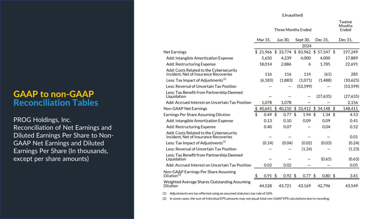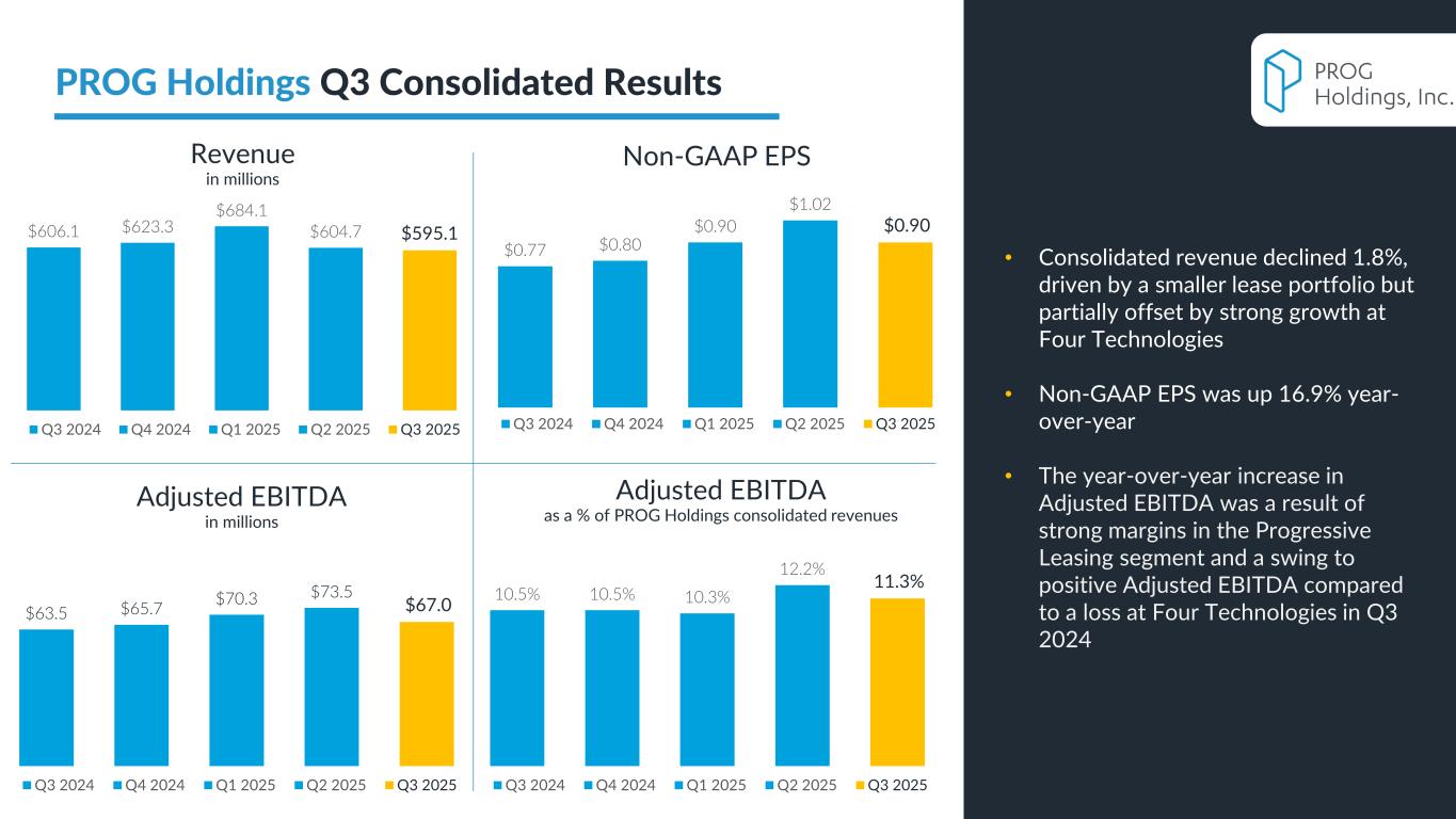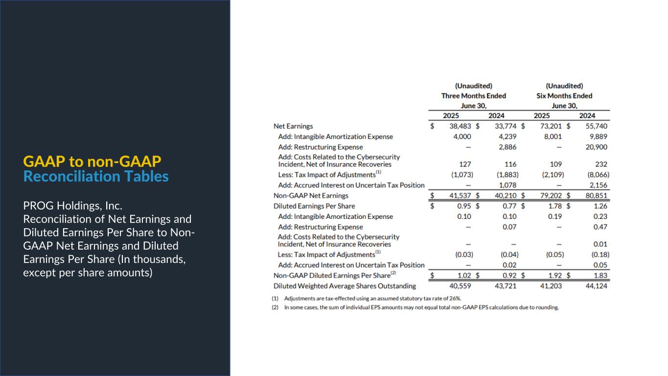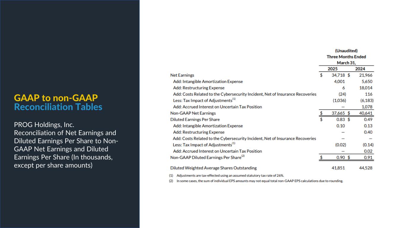 PROG Internal Non-GAAP net earnings, non-GAAP diluted earnings per share, and adjusted EBITDA are supplemental measures of our performance that are not calculated in accordance with generally accepted accounting principles in the United States ("GAAP"). Non-GAAP diluted earnings per share from continuing operations for the full year 2025 and fourth quarter 2025 outlook excludes intangible amortization expense and also excludes Vive as its normal operations have been discontinued as a result of the sale of its credit card portfolio in October 2025. The Vive segment will be presented as discontinued operations beginning in the fourth quarter of 2025. Adjusted EBITDA excludes Vive's operations as well as the gain on the sale of the credit card portfolio. Non-GAAP net earnings and non-GAAP diluted earnings per share for the three and nine months ended September 30, 2025, exclude intangible amortization expense, transaction costs and costs related to the cybersecurity incident, net of insurance recoveries. Non-GAAP net earnings and non-GAAP diluted earnings per share for the three and nine months ended September 30, 2024 exclude intangible amortization expense, restructuring expenses, costs related to the cybersecurity incident, and reversal of the uncertain tax position related to Progressive Leasing’s $175 million settlement with the FTC in 2020. The amount for the after-tax non-GAAP adjustment, which is tax effected using our statutory tax rate, can be found in the reconciliation of net earnings and diluted earnings per share to non-GAAP net earnings and diluted earnings per share table in this presentation. The Adjusted EBITDA figures presented in this presentation are calculated as the Company’s earnings before interest expense, net, depreciation on property and equipment, amortization of intangible assets and income taxes. Adjusted EBITDA for the full year 2025 and fourth quarter 2025 outlook excludes stock-based compensation expense. Adjusted EBITDA for the three and nine months ended September 30, 2025 excludes stock-based compensation expense, costs related to the cybersecurity incident, net of insurance recoveries and transaction costs. Adjusted EBITDA for the three and nine months ended September 30, 2024 excludes stock-based compensation expense, restructuring expenses, and costs related to the cybersecurity incident, net of insurance recoveries. The amounts for these pre-tax non-GAAP adjustments can be found in the segment EBITDA tables in this presentation. Management believes that non-GAAP net earnings, non-GAAP diluted earnings per share, and adjusted EBITDA provide relevant and useful information, and are widely used by analysts, investors and competitors in our industry as well as by our management in assessing both consolidated and business unit performance. Non-GAAP net earnings, non-GAAP diluted earnings, and adjusted EBITDA provide management and investors with an understanding of the results from the primary operations of our business by excluding the effects of certain items that generally arose from larger, one-time transactions that are not reflective of the ordinary earnings activity of our operations or transactions that have variability and volatility of the amount. We believe the exclusion of stock-based compensation expense provides for a better comparison of our operating results with our peer companies as the calculations of stock-based compensation vary from period to period and company to company due to different valuation methodologies, subjective assumptions and the variety of award types. This measure may be useful to an investor in evaluating the underlying operating performance of our business. Adjusted EBITDA also provides management and investors with an understanding of one aspect of earnings before the impact of investing and financing charges and income taxes. These measures may be useful to an investor in evaluating our operating performance because the measures: • Are widely used by investors to measure a company’s operating performance without regard to items excluded from the calculation of such measure, which can vary substantially from company to company depending upon accounting methods, book value of assets, capital structure and the method by which assets were acquired, among other factors. • Are used by rating agencies, lenders and other parties to evaluate our creditworthiness. • Are used by our management for various purposes, including as a measure of performance of our operating entities and as a basis for strategic planning and forecasting. Non-GAAP financial measures, however, should not be used as a substitute for, or considered superior to, measures of financial performance prepared in accordance with GAAP, such as the Company’s GAAP basis net earnings and diluted earnings per share and the GAAP revenues and earnings before income taxes of the Company’s segments, which are also included in the presentation. Further, we caution investors that amounts presented in accordance with our definitions of non-GAAP net earnings, non-GAAP diluted earnings per share, and adjusted EBITDA may not be comparable to similar measures disclosed by other companies, because not all companies and analysts calculate these measures in the same manner. Use of Non-GAAP Financial Measures