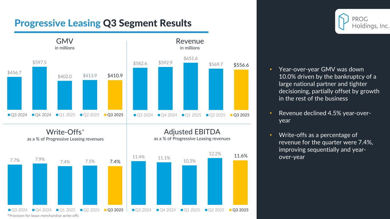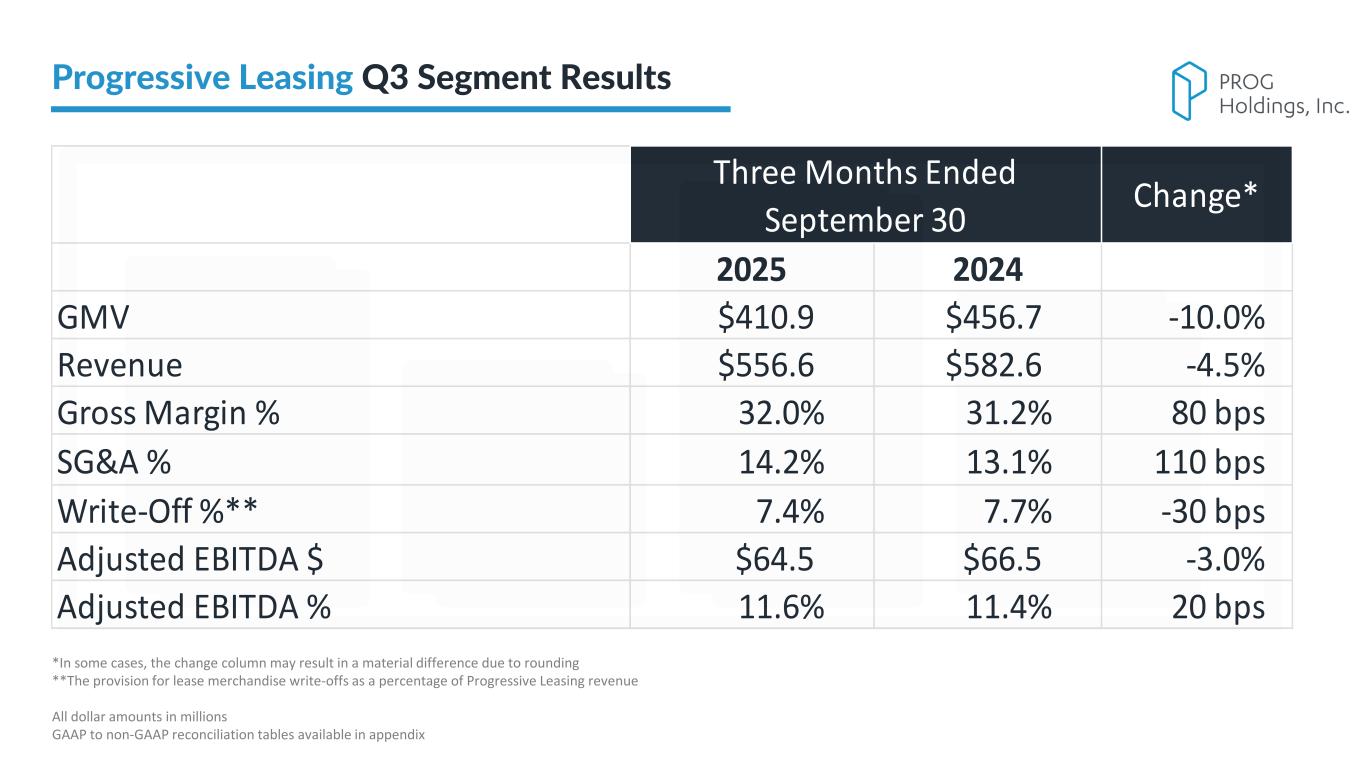 PROG Internal 2025 2024 GMV $410.9 $456.7 -10.0% Revenue $556.6 $582.6 -4.5% Gross Margin % 32.0% 31.2% 80 bps SG&A % 14.2% 13.1% 110 bps Write-Off %** 7.4% 7.7% -30 bps Adjusted EBITDA $ $64.5 $66.5 -3.0% Adjusted EBITDA % 11.6% 11.4% 20 bps Three Months Ended September 30 Change* *In some cases, the change column may result in a material difference due to rounding **The provision for lease merchandise write-offs as a percentage of Progressive Leasing revenue All dollar amounts in millions GAAP to non-GAAP reconciliation tables available in appendix Progressive Leasing Q3 Segment Results