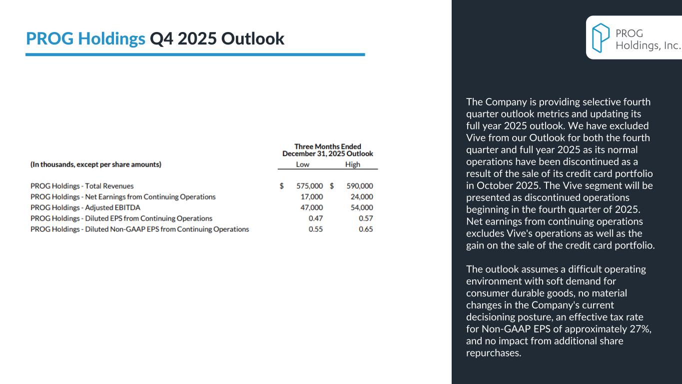 PROG Internal 12 PROG Holdings Q4 2025 Outlook The Company is providing selective fourth quarter outlook metrics and updating its full year 2025 outlook. We have excluded Vive from our Outlook for both the fourth quarter and full year 2025 as its normal operations have been discontinued as a result of the sale of its credit card portfolio in October 2025. The Vive segment will be presented as discontinued operations beginning in the fourth quarter of 2025. Net earnings from continuing operations excludes Vive's operations as well as the gain on the sale of the credit card portfolio. The outlook assumes a difficult operating environment with soft demand for consumer durable goods, no material changes in the Company's current decisioning posture, an effective tax rate for Non-GAAP EPS of approximately 27%, and no impact from additional share repurchases.