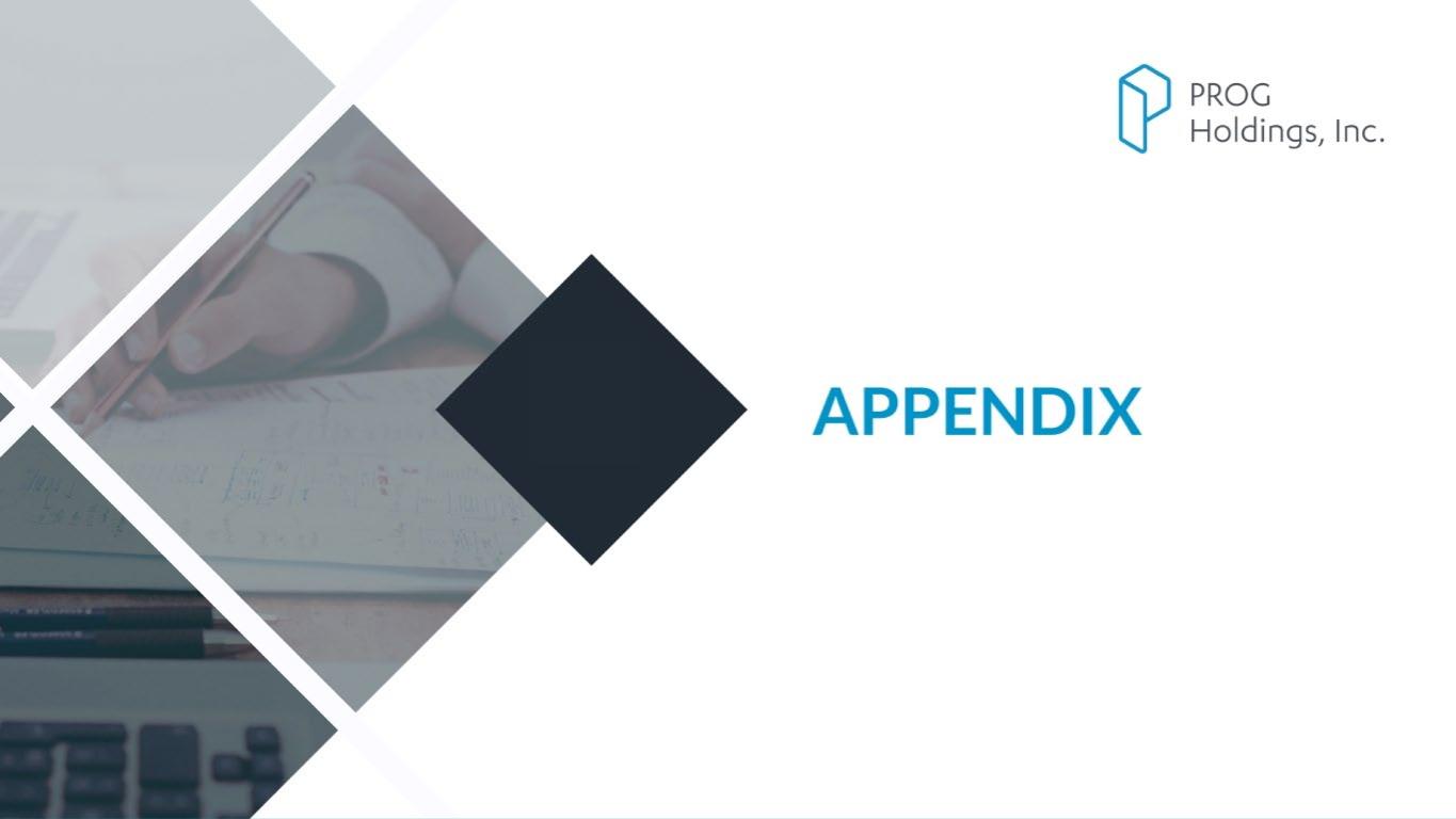 PROG Internal *(Gross debt minus cash and cash equivalents) divided by trailing 12 month adjusted EBITDA PROG Holdings Consolidated Results Cash and Cash Equivalents As of 9/30/2025 $292.6M Gross Debt As of 9/30/2025 $600M Net Leverage Ratio* As of 9/30/2025 1.11x Cash Flow From Operations Nine Months Ended 9/30/2025 $389.9M