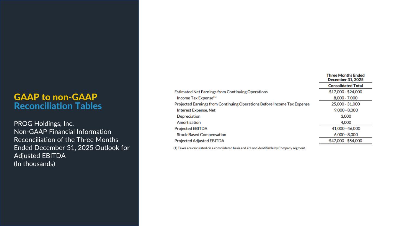 PROG Internal GAAP to non-GAAP Reconciliation Tables PROG Holdings, Inc. Non-GAAP Financial Information Reconciliation of the Three Months Ended December 31, 2025 Outlook for Adjusted EBITDA (In thousands)