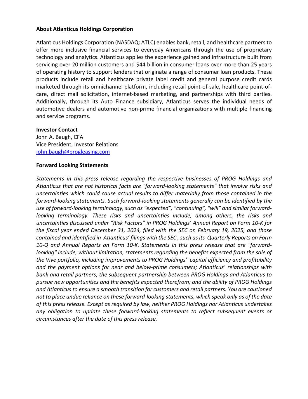 About Atlanticus Holdings Corporation Atlanticus Holdings Corporation (NASDAQ: ATLC) enables bank, retail, and healthcare partners to offer more inclusive financial services to everyday Americans through the use of proprietary technology and analytics. Atlanticus applies the experience gained and infrastructure built from servicing over 20 million customers and $44 billion in consumer loans over more than 25 years of operating history to support lenders that originate a range of consumer loan products. These products include retail and healthcare private label credit and general purpose credit cards marketed through its omnichannel platform, including retail point-of-sale, healthcare point-of- care, direct mail solicitation, internet-based marketing, and partnerships with third parties. Additionally, through its Auto Finance subsidiary, Atlanticus serves the individual needs of automotive dealers and automotive non-prime financial organizations with multiple financing and service programs. Investor Contact John A. Baugh, CFA Vice President, Investor Relations john.baugh@progleasing.com Forward Looking Statements Statements in this press release regarding the respective businesses of PROG Holdings and Atlanticus that are not historical facts are "forward-looking statements" that involve risks and uncertainties which could cause actual results to differ materially from those contained in the forward-looking statements. Such forward-looking statements generally can be identified by the use of forward-looking terminology, such as “expected”, “continuing”, “will” and similar forward- looking terminology. These risks and uncertainties include, among others, the risks and uncertainties discussed under “Risk Factors” in PROG Holdings’ Annual Report on Form 10-K for the fiscal year ended December 31, 2024, filed with the SEC on February 19, 2025, and those contained and identified in Atlanticus’ filings with the SEC , such as its Quarterly Reports on Form 10-Q and Annual Reports on Form 10-K. Statements in this press release that are "forward- looking" include, without limitation, statements regarding the benefits expected from the sale of the Vive portfolio, including improvements to PROG Holdings’ capital efficiency and profitability and the payment options for near and below-prime consumers; Atlanticus’ relationships with bank and retail partners; the subsequent partnership between PROG Holdings and Atlanticus to pursue new opportunities and the benefits expected therefrom; and the ability of PROG Holdings and Atlanticus to ensure a smooth transition for customers and retail partners. You are cautioned not to place undue reliance on these forward-looking statements, which speak only as of the date of this press release. Except as required by law, neither PROG Holdings nor Atlanticus undertakes any obligation to update these forward-looking statements to reflect subsequent events or circumstances after the date of this press release.